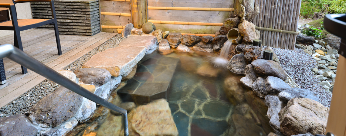 客室露天浴池設有露台,能欣賞到日本庭園的優美景致,是開放感十足的房型。